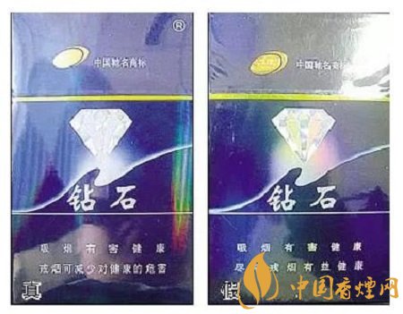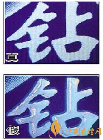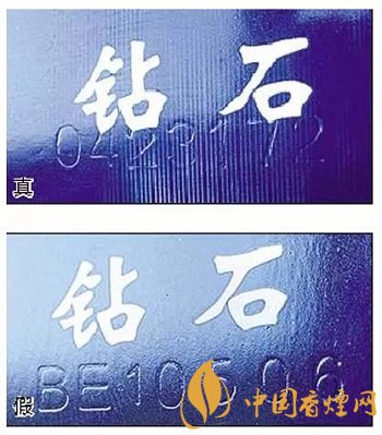 真煙鉆石圖案印刷清晰,色彩感強(qiáng),內(nèi)有微縮英文字母“DIAMOND”,圖案無凹凸感;假煙印刷不清晰,用手摸上去有凹凸感。
