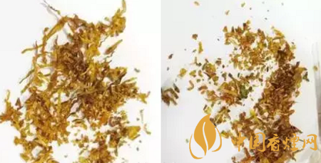 真煙的煙絲切絲均勻、碎末少,油潤性好,看上去呈金黃色;假煙的煙絲雜質(zhì)多、油潤性差,看上去顏色較淡。