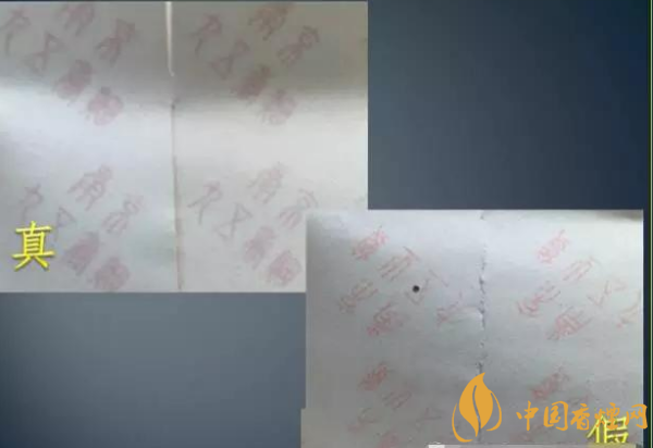 條盒底紋采用絲網(wǎng)印刷,墨層厚,觸摸有明顯的凹凸感,色澤亮麗。下圖側(cè)看真假對比效果。
