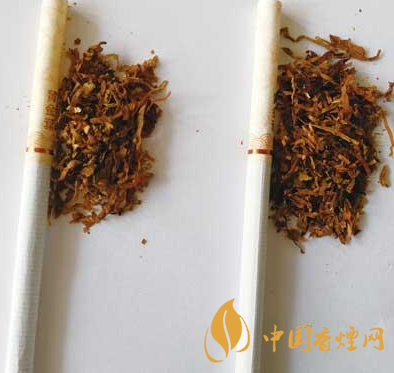 煙支及煙絲差異對比:真煙煙支的水松紙顏色偏黃,煙絲結(jié)構(gòu)為純?nèi)~絲;假煙煙支水松紙顏色偏淡,煙絲結(jié)構(gòu)為葉絲、造紙法再造煙葉,與真品特征存在明顯差異。