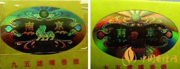 小盒頂部鐳射燙印防偽標(biāo)識(shí)差異比對(duì):真品卷煙小盒頂部鐳射燙印防偽標(biāo)識(shí)圖案中幾個(gè)切換亮點(diǎn),南京、辟邪和二龍戲珠組合,切換不同角度時(shí),幾組鐳射燙印會(huì)呈現(xiàn)出不同防偽效果圖案,二龍戲珠里暗藏有重疊“九五香煙”四個(gè)字,切換角度時(shí),幾個(gè)字能自由切換出來(lái),鐳射燙金仿制難度極高;假煙小盒頂部鐳射燙印防偽標(biāo)采用“掃描照相”等仿制技術(shù),套色燙金嚴(yán)重失真,特別是二龍戲珠暗藏的“九五香煙”四個(gè)字模糊不清無(wú)法呈現(xiàn)出來(lái),與真品鐳射燙印防偽標(biāo)識(shí)差異明顯。