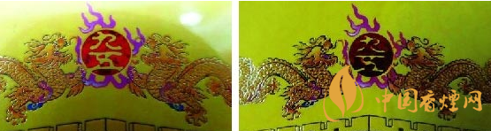 小盒商標(biāo)紙燙金套印工藝差異比對(duì):真品卷煙小盒商標(biāo)紙雕刻燙金套印工藝,龍鱗顏色均勻一致,龍珠里“九五”兩字燙金字體飽滿(mǎn);假煙印刷工藝仿制粗糙,龍鱗顏色失真,龍珠里“九五”套印不準(zhǔn),字體邊緣有明顯脫漆掉色現(xiàn)象,與真品呈現(xiàn)效果差異明顯。