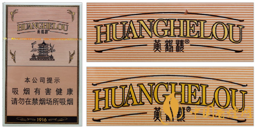 真品卷煙:商標(biāo)紙采用凹印,黑色與黃色交界邊緣有鋸齒痕跡;“HUANGHELOU”拼音字母黃色為淡黃色。