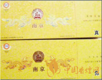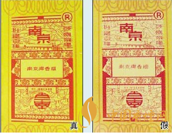 真煙條盒正面的“雙龍”、“南京”等圖案的立體感強(qiáng),摸上去凹凸感明顯,底色為明黃色;假煙的“雙龍”、“南京”等圖案大都無凹凸感,底色呈黃色。