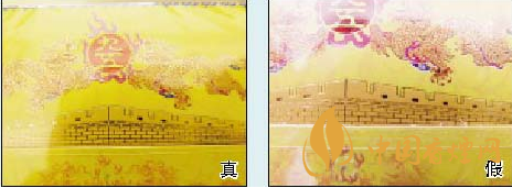 真煙上的城墻圖案印刷精致,城墻磚縫線條工整清晰;假煙的城墻圖案印刷粗糙,燙金效果差,會(huì)出現(xiàn)城墻磚縫線條斷開、加粗、模糊等現(xiàn)象。