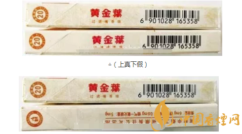 真煙:黃金葉(天香細(xì)支)拉線頭位置(在標(biāo)有生產(chǎn)廠家)在條形碼左側(cè),條形碼及數(shù)字筆畫較細(xì)。